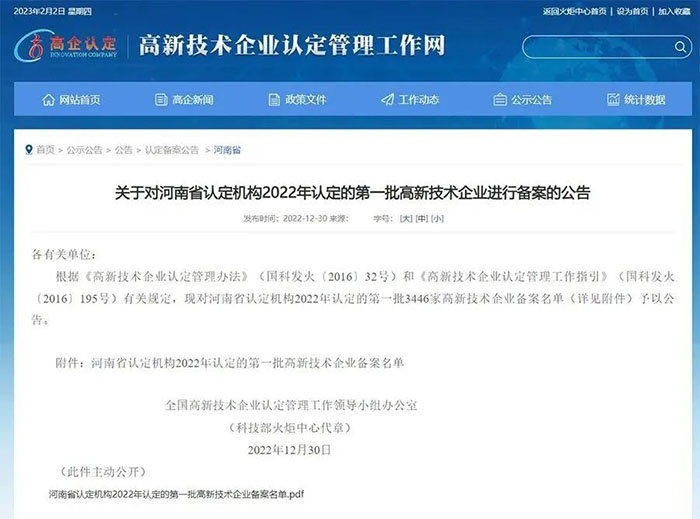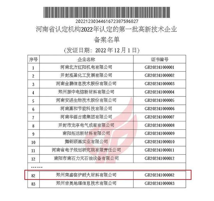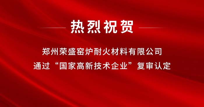 近日,高新技術企業認定管理工作領導小組辦公室發布了《關于對河南省認定機構2022年認定的一批高新技術企業進行備案的公告》。由多個部門審核推薦,經專家評審,鄭州榮盛窯爐耐火材料有限公司通過2022年度“國家高新技術企業”復審。此次是2019年公司初次獲得國家高新技術企業以來,再次被復審認定為國家高新技術企業。