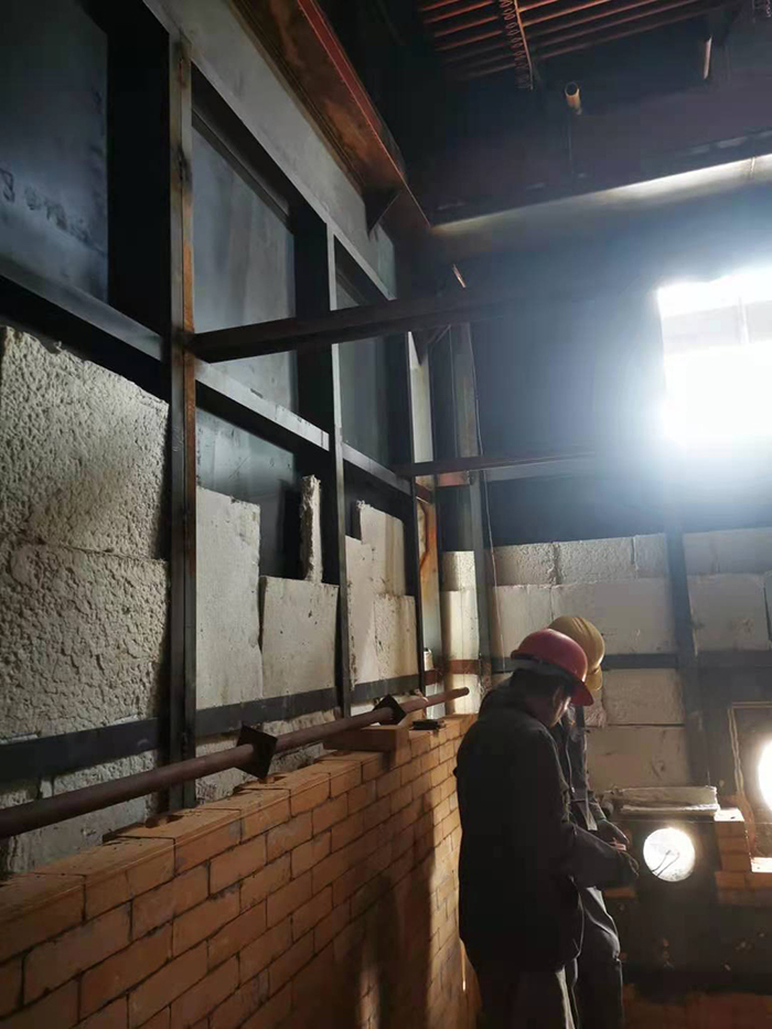 爐墻由內(nèi)外兩層組成,耐火的內(nèi)襯墻用T-3標(biāo)準(zhǔn)耐火磚砌成,隔熱的外墻用機(jī)制紅磚砌成。為改善隔熱性能,在耐火磚與紅磚之間留有20mm左右的隔熱層,填充隔熱材料,或在中間砌16mm硅藻土隔熱耐火磚。紅磚外墻四壁轉(zhuǎn)角要求相互咬砌,使四壁形成整體,外面用輕型鋼架將外壁箍住,有的外墻外面不加鋼架,形似普通磚墻。