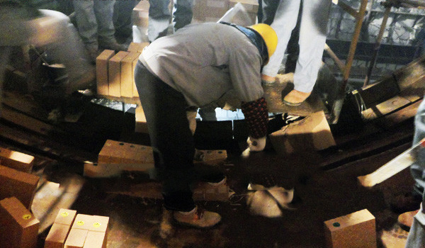 圖為工人們正在對(duì)水泥窯口安裝、并有序的進(jìn)行校對(duì)砌筑。