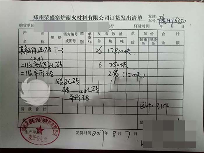 這次發(fā)貨的對(duì)象是江西的客戶,江西的客戶要了17810塊t-3莫來石保溫磚、250塊二級(jí)高鋁孔磚、120塊二級(jí)異型磚。江西客戶也是榮盛的老客戶了,這次的訂單江西客戶對(duì)榮盛表現(xiàn)出了十分的信任,并沒有派人再到鄭州進(jìn)行考察,是直接給榮盛銷售達(dá)到電話訂的單,并且在電話里表達(dá)出了想和榮盛保持長期合作的態(tài)度,出于對(duì)合作伙伴的支持,榮盛也給了江西客戶優(yōu)惠的價(jià)格。
